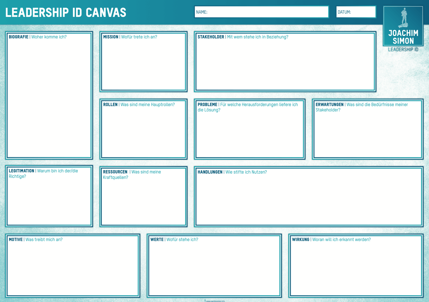 Dies ist mein Original Leadership ID Canvas, mit dem ich auch in meinen Coachings arbeite.