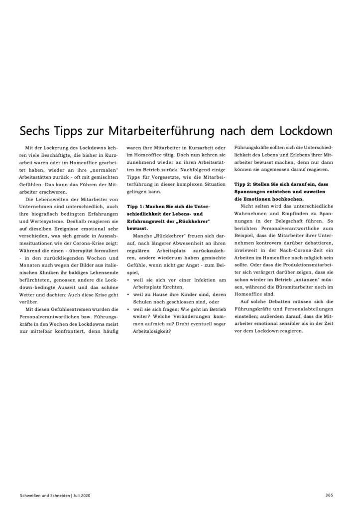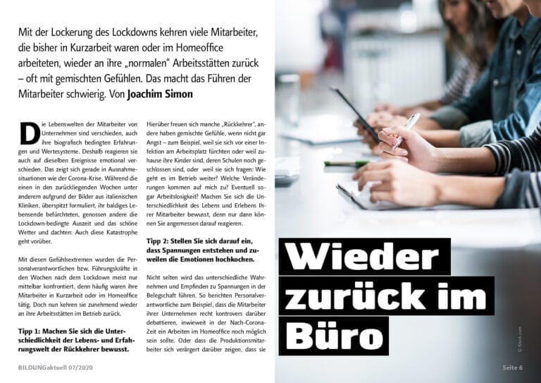 Aktuell sind viele Mitarbeiter der Unternehmen, die während des corona-bedingten Lockdowns in Kurzarbeit waren oder im Homeoffice arbeiteten, nachdem sie in den Regelbetrieb zurückkehrten, extrem verunsichert. Das macht das Führen dieser Mitarbeiter schwierig...