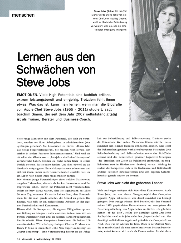 EMOTIONEN. Viele High Potentials sind fachlich brillant, extrem leistungsbereit und ehrgeizig. Trotzdem fehlt ihnen etwas. Was das ist, kann man lernen, wenn man die Biografie von Apple-Chef Steve Jobs (1955 - 2011) studiert, sagt Joachim Simon, der seit dem Jahr 2007 selbstständig tätig ist als Trainer, Berater und Business-Coach.