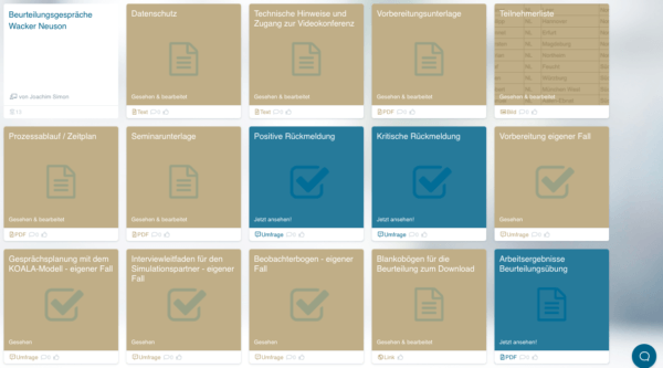 Lernen geschieht nicht nur synchron im Live-Setting! Die wichtigen Vorbereitungs-, Vertiefungs- und Transferphasen geschehen bei iLOFT über die integrierte Online-Academy. Hier sind sämtliche Inhalte so aufbereitet, dass die Teilnehmer sie in ihrem eigenen Lerntempo bearbeiten können. Dabei legen wir großen wert darauf, dass möglichst keine Arbeitsblätter etc. ausgedruckt werden müssen, sondern alles direkt am Bildschirm bearbeitet werden kann. Innerhalb der asynchronen Online-Academy gibt es eine Vielzahl von Medien und Methoden wie Texte, Audiodateien, Videos, Multiple-Choice- und Freitextfragen.