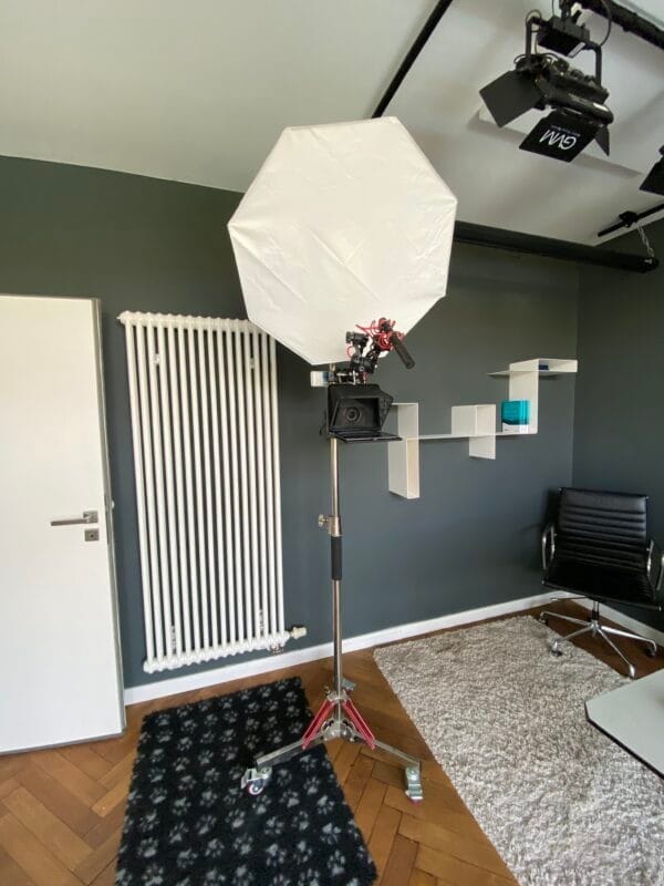 Solider Lichtmast als Ständer für Mikrofon, Lampe und Kamera. Wenn dort alles montiert ist, hast Du Ruhe und Ordnung.