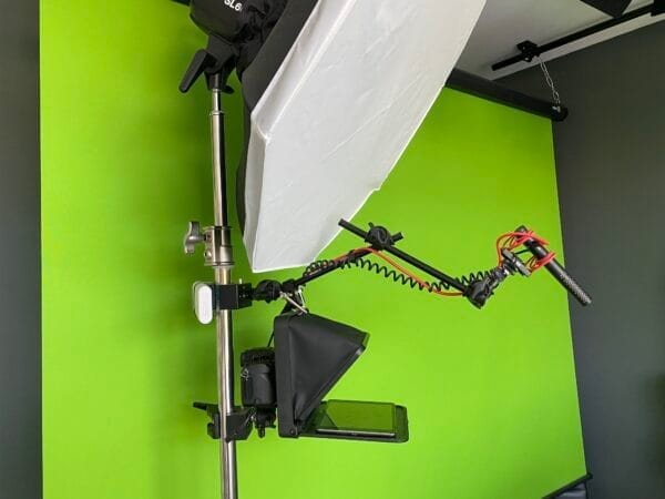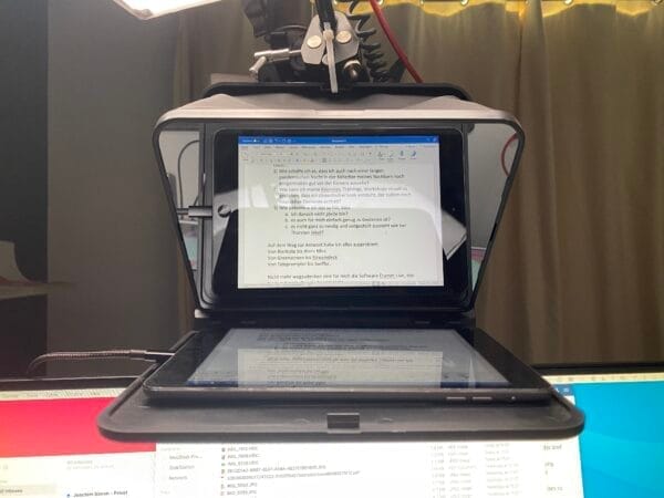 Dieser Prompter ist relativ leicht und klein. So kann es an die Kamera, die am Stativ montiert ist, angebracht werden. Mit größeren Telepromptern klappt das nicht, da sie nach hinten hin sehr viel Platz benötigen und recht schwer sind. Das Bild kommt über ein älteres iPad mini, das ich als externen Bildschirm per Software "Luna Display" verbinde.